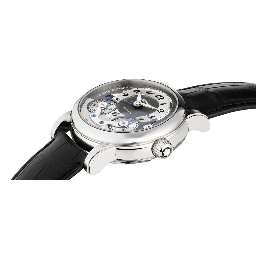 43 mm watch with stainless steel case, Montblanc Calibre MB R200, monopusher chronograph with automatic winding, anthracite-coloured dial with applique hour circle, date display, second time zone with day/night display, chronograph counters with rotating discs.